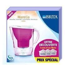 Carafe Marella Capacité : 2,4L dont 1,4L d'eau filtrée Clapet de remplissage manuel Memo : indicateur électronique de changement de cartouche Adaptée à la porte du réfrigérateur  Cartouche Maxtra (1 pack de 2 cart. + 1 cart. incluse dans la carafe) Réduit tartre, chlore, plomb 3 mois d'eau filtrée Conforme à la norme AFNOR NF P41-650 Cartouches recyclables par BRITA